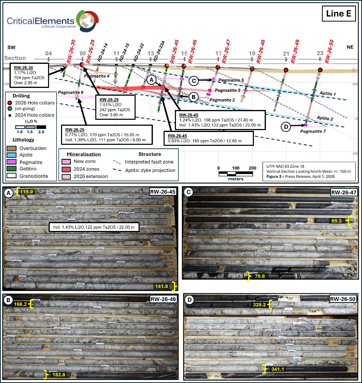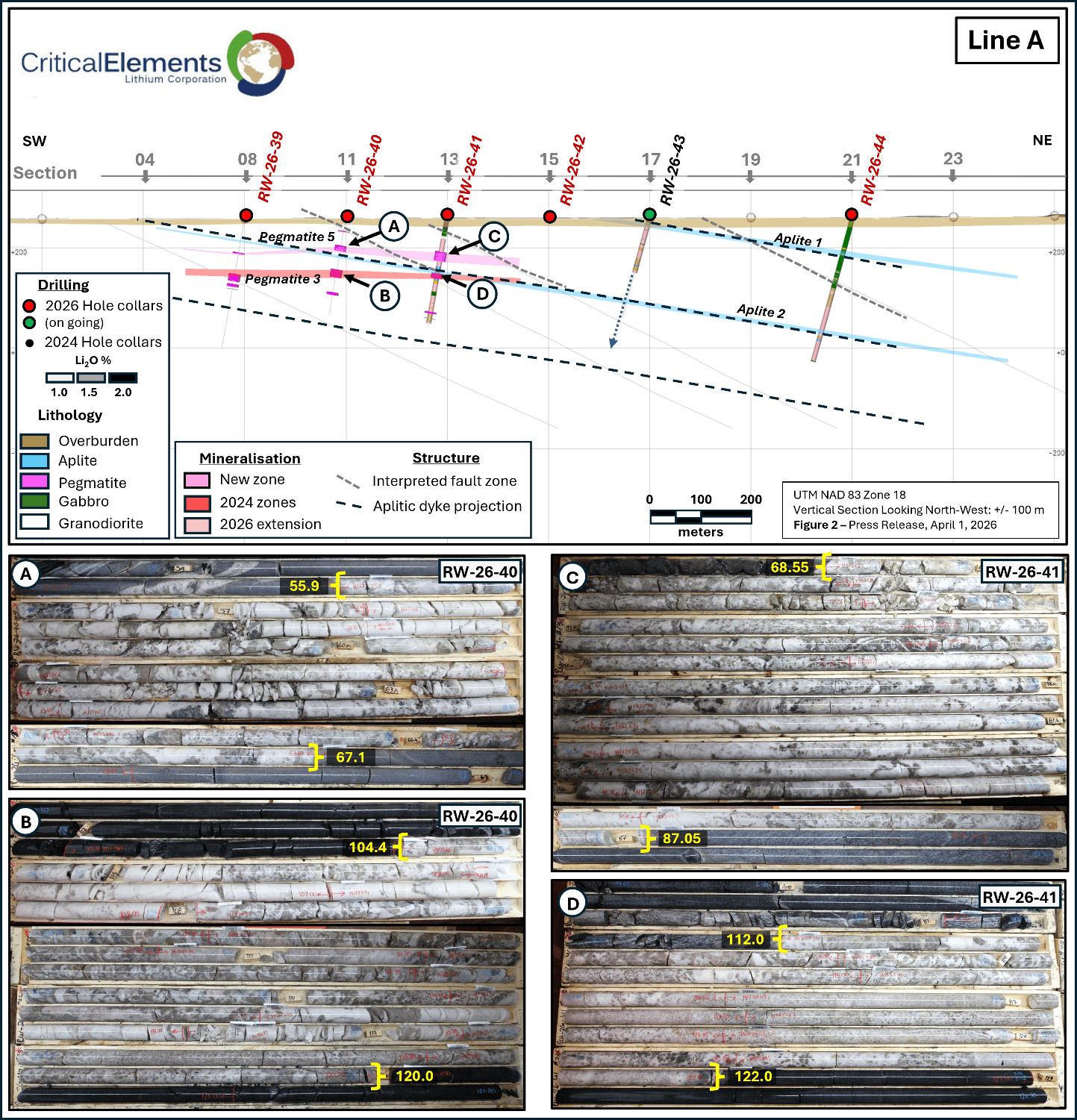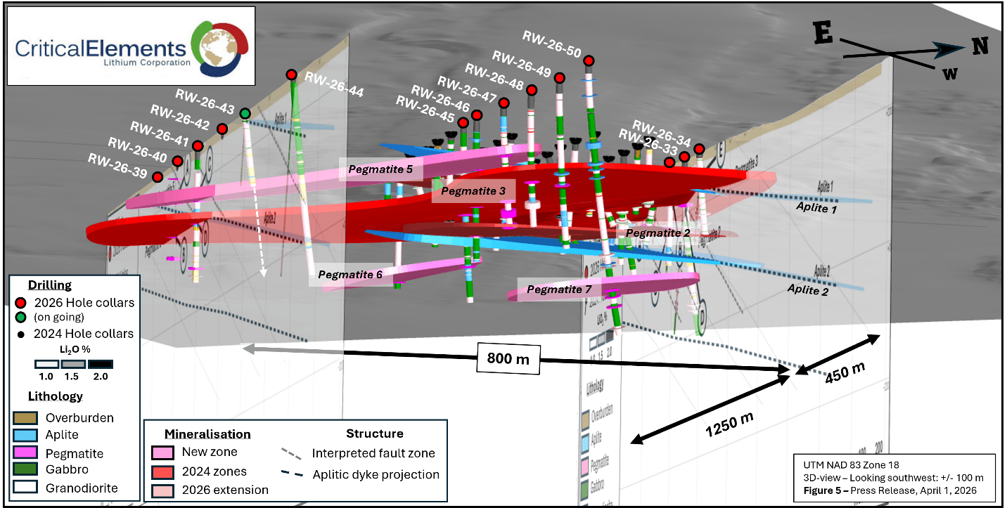 April 1st, 2026 – MONTRÉAL, QUÉBEC – Critical Elements Lithium Corporation (TSX-V: CRE) (US OTCQX: CRECF) (FSE: F12) (“Critical Elements” or the “Corporation”) is pleased to provide an update on its Phase 1 Winter 2026 drill program, at the 100% owned Rose West Discovery (“Rose West”), located in Eeyou Istchee, Québec. Rose West is situated within 10 km of the highly advanced Rose Lithium-Tantalum Project (“Rose”). Rose West was previously documented as a near surface, sub-horizontal 10-40 m thick lithium-rich pegmatite bearing zone intercepted by drilling over a 450 m x 370 m footprint area in the winter of 2024 (see Press Release dated February 3, 2026). Recent drilling confirms the presence of spodumene rich intervals all around the initial core zone, and especially towards the East Target area, extending the main pegmatite body by about 800 meters towards the east and by about 400 meters to the south, thus bringing its overall footprint to 1250 m x 800 m. Furthermore, the recent drilling has identified three (3) new spodumene-bearing pegmatitic bodies within the target area; a significant addition to the working model as it could potentially lead to rapid growth of the mineral inventory within the footprint of the project.