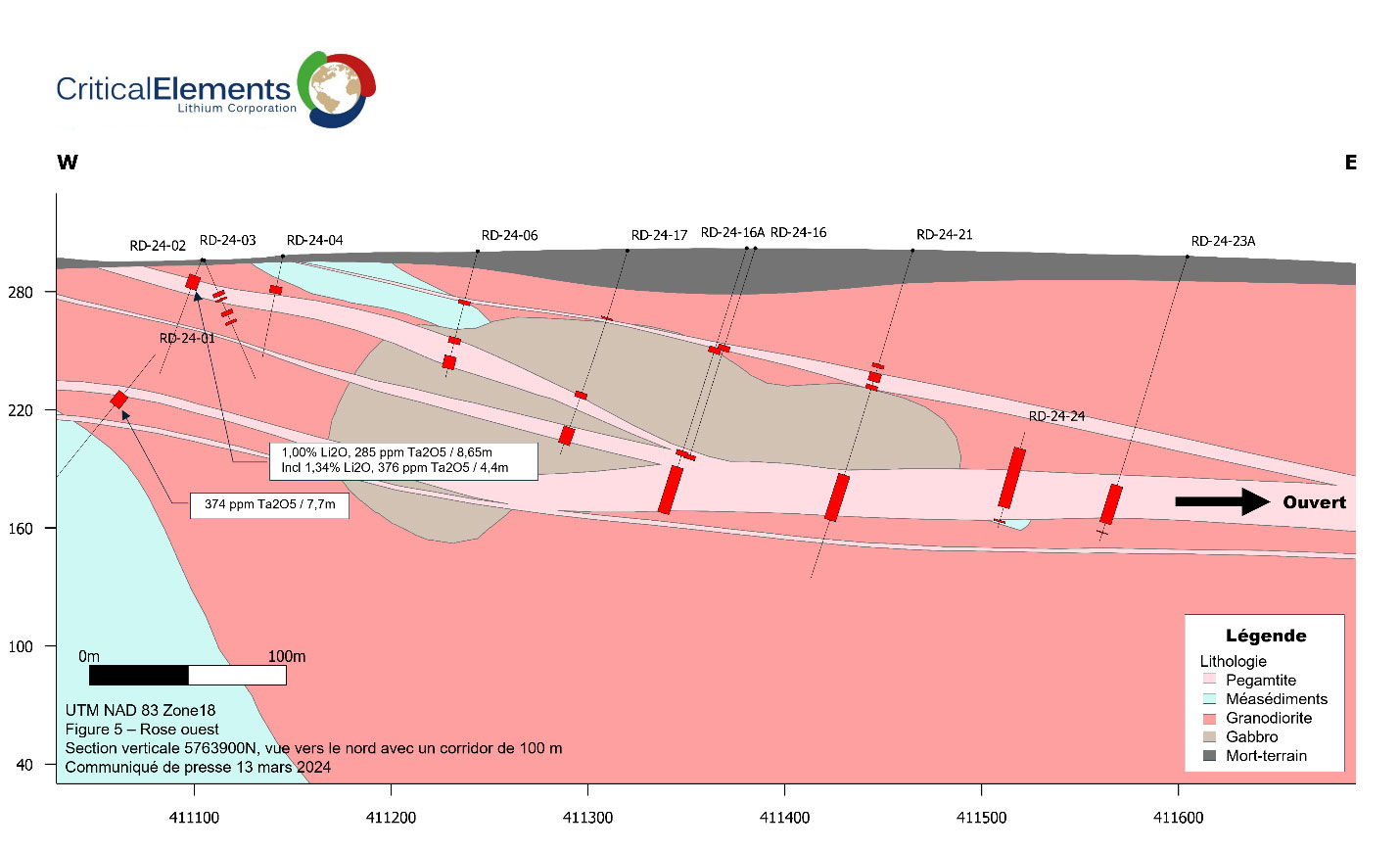 Le 13 mars 2024 – MONTRÉAL, QUÉBEC – Corporation Lithium Éléments Critiques (TSX-V: CRE) (US OTCQX: CRECF) (FSE: F12) (« Critical Elements » ou la « Société ») est heureuse d’annoncer l’achèvement d’une campagne de forage de 31 sondages, 3 670 mètres sur la découverte Rose ouest, qu’elle détient à 100 %, avec de multiples intersections de pegmatites riches en spodumène.